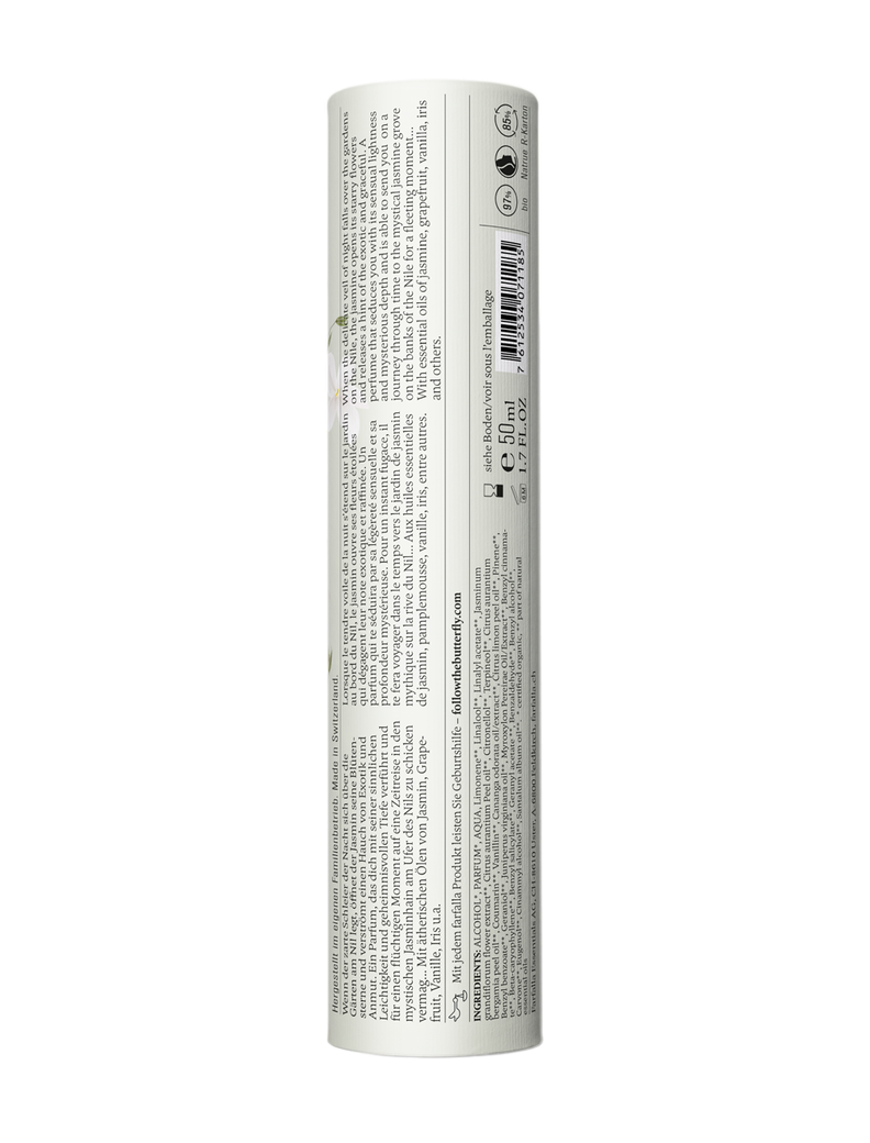 Jasmine Garden von farfalla entführt Dich in einen nächtlichen Garten am Nil, wo der betörende Duft blühender Jasminsterne die Luft erfüllt. Die zarte Frische von Grapefruit trifft auf die sinnliche Tiefe von Vanille und Iris – ein harmonisches Spiel aus Leichtigkeit und Verführung.